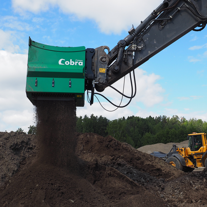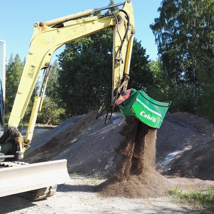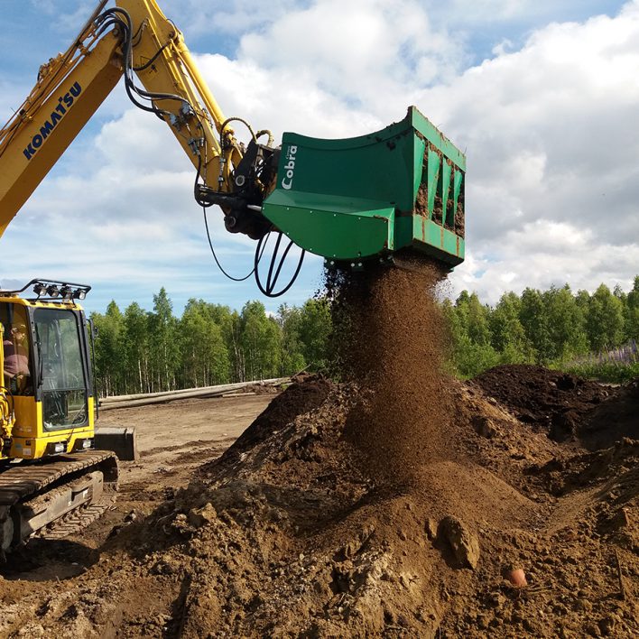 With Cobra Screening Buckets you can effectively screen, crush, separate, sort, recycle, re-use, mix, backfill and/or aerate many different materials like soil, dirt, peat, waste soil, demolition waste, industrial by-products, frozen materials, etc. You can process also wet materials.